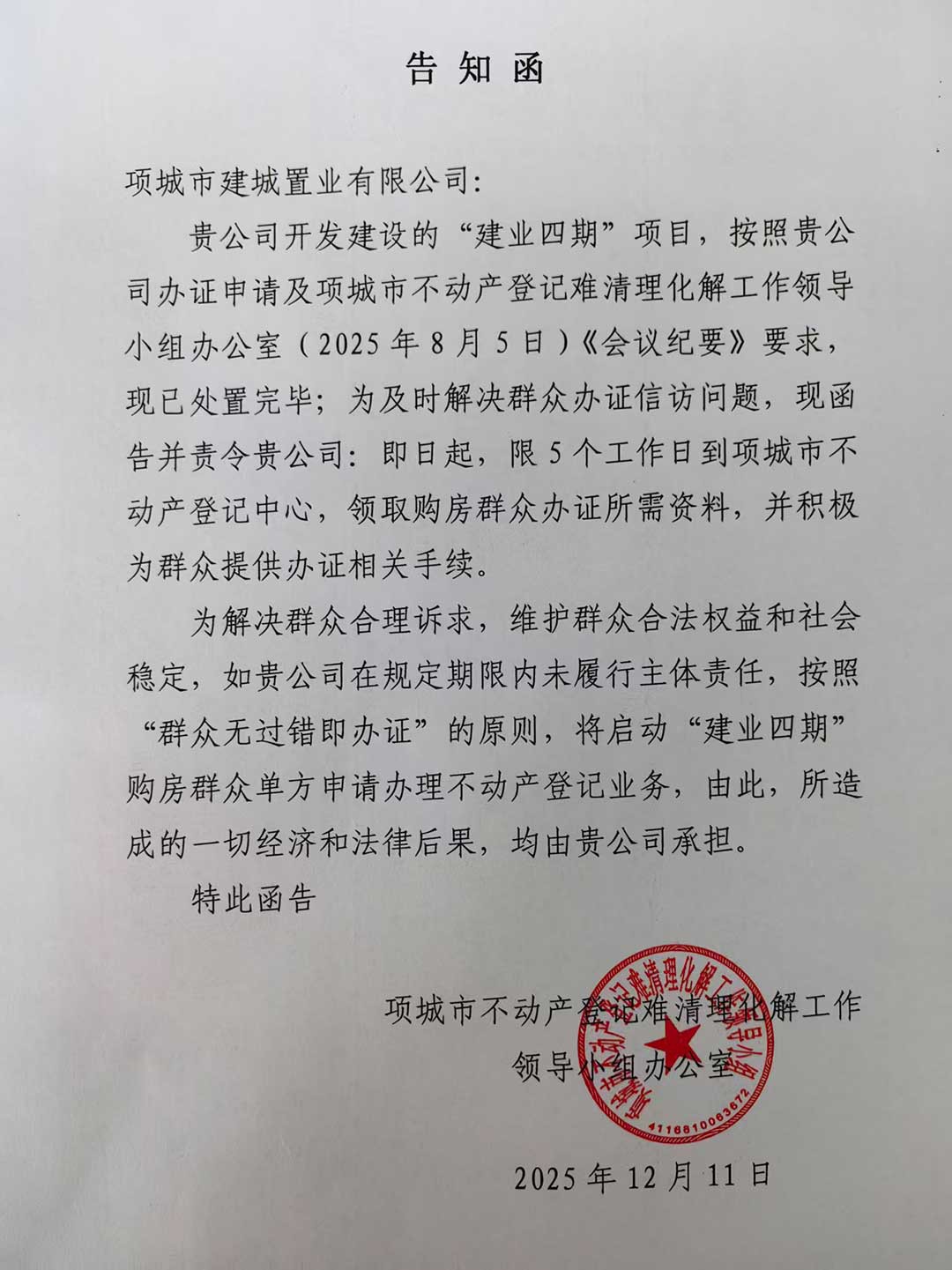 项城市不动产登记难清理化解工作领导小组办公室关于对项城市建城置业有限公司的告知函