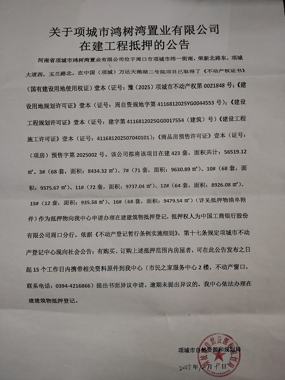 关于项城市鸿树湾置业有限公司在建工程抵押的公告
