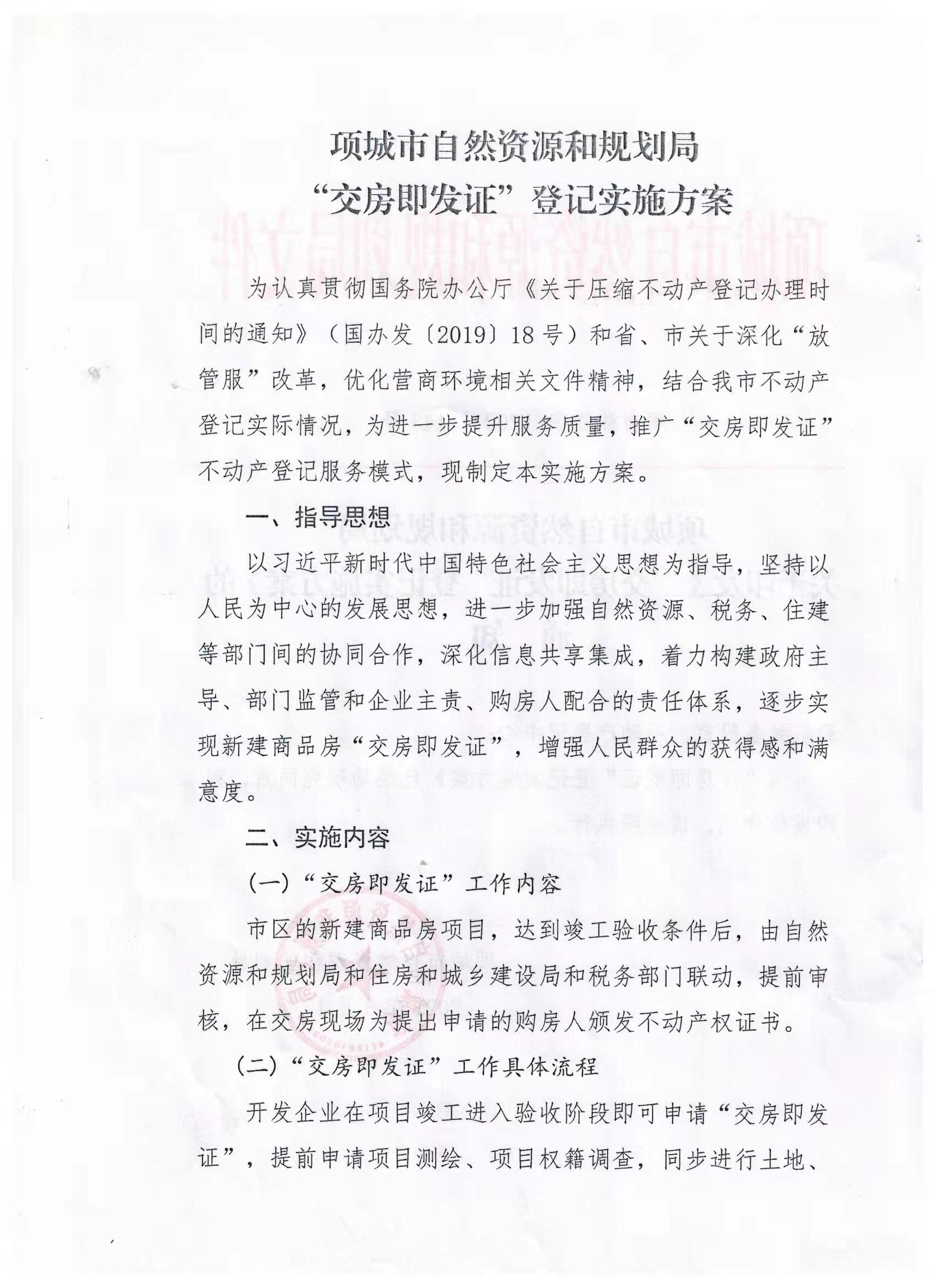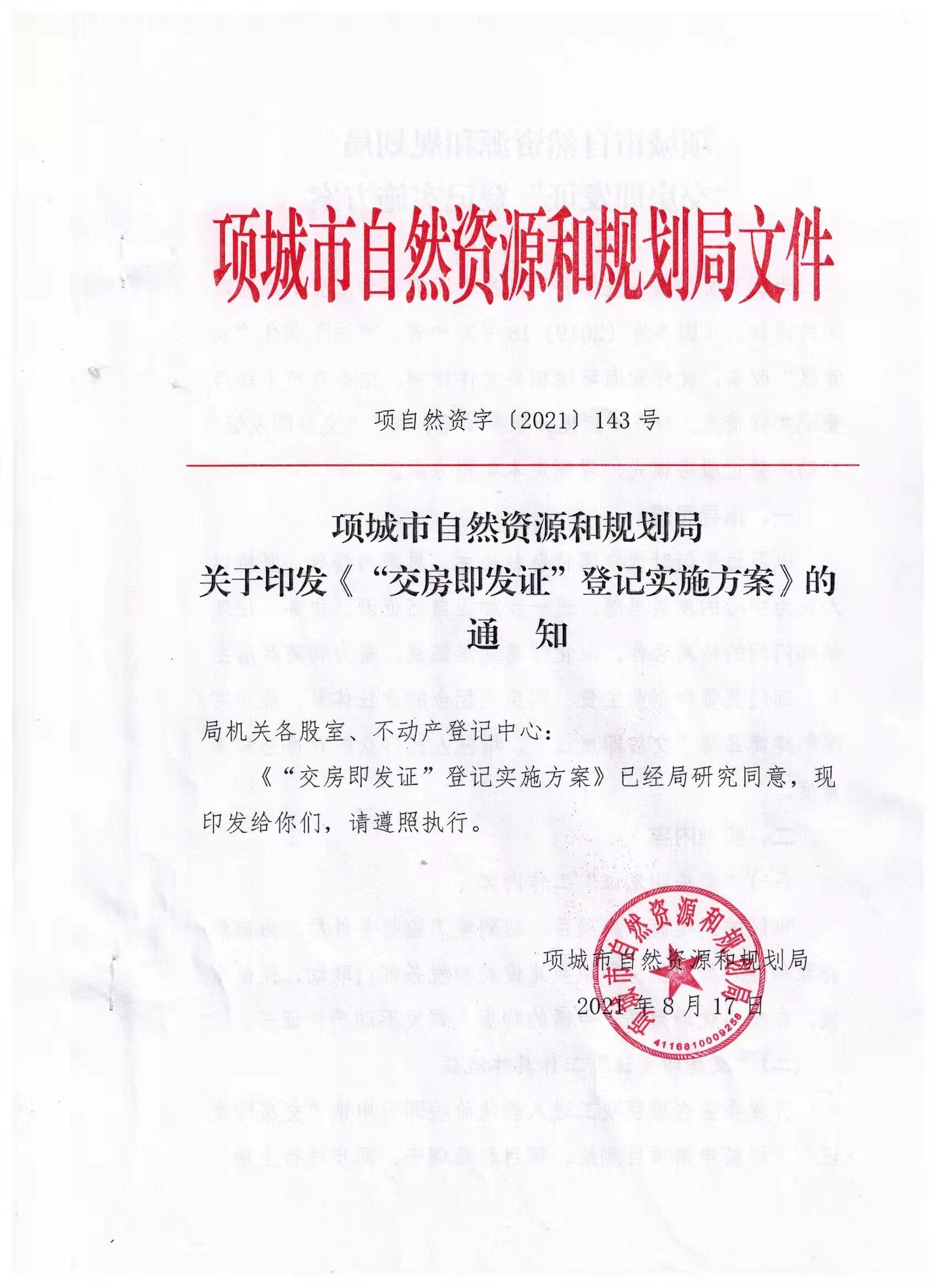 项城市自然资源和规划局关于印发《“交房即发证”登记实施方案》的通知