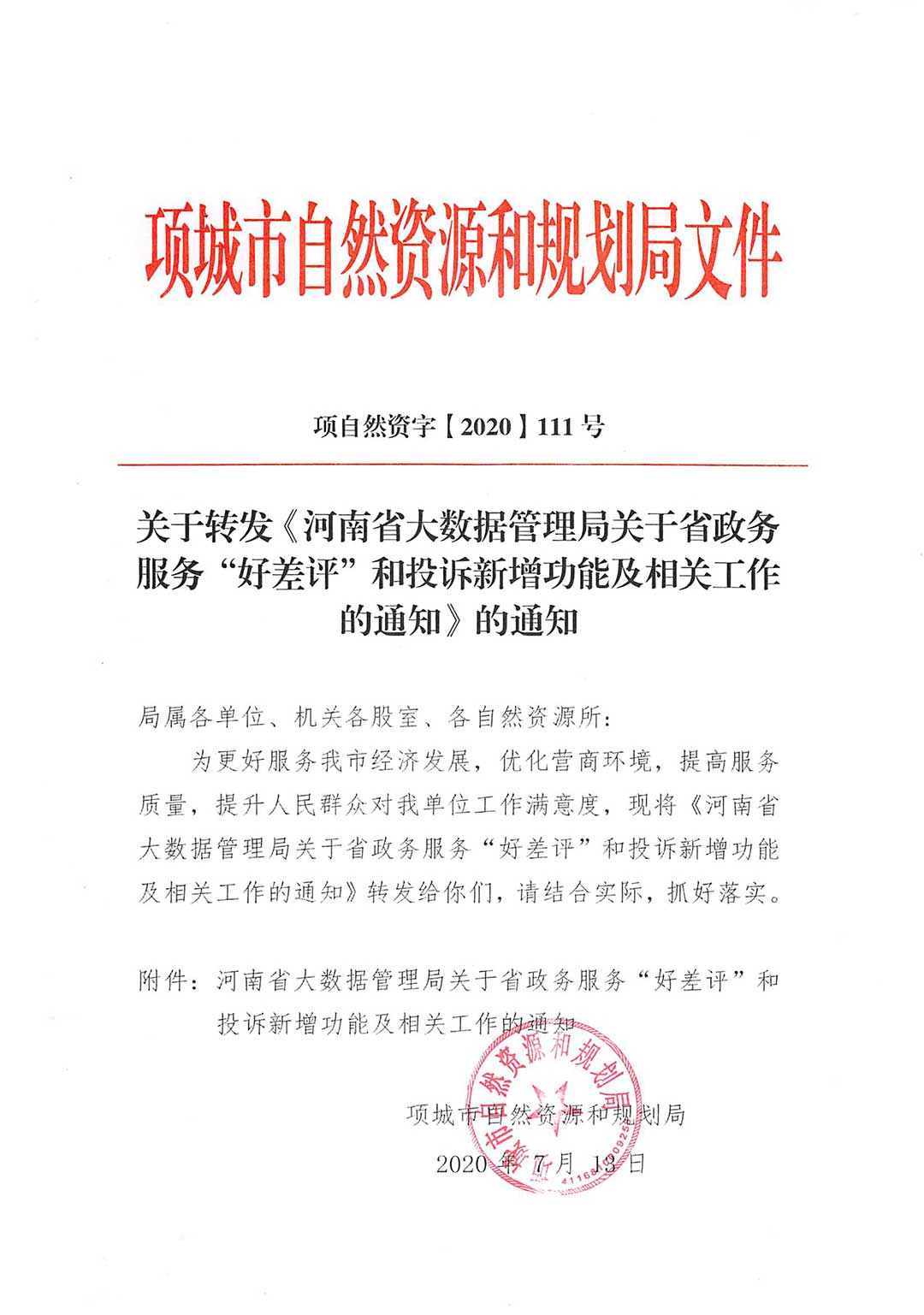 关于转发《河南省大数据管理局关于省政务服务“好差评”和投诉新增功能及相关工作的通知》的通知